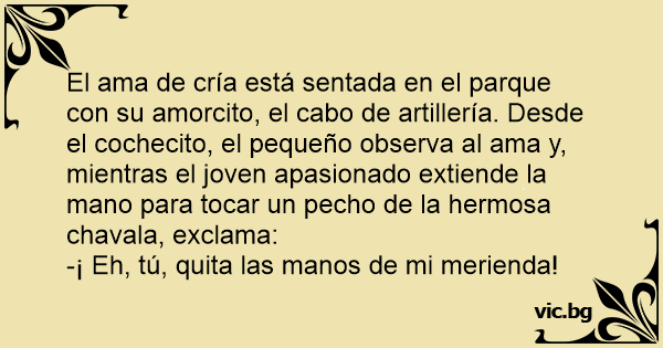 El ama de cría está sentada en el parque соn su amorcito, el cabo de artillería. Desde el cochecito, el pequeño observa al ama y, mientras el joven apasionado extiende la mano para tocar un pecho de la hermosa chavala, exclama: