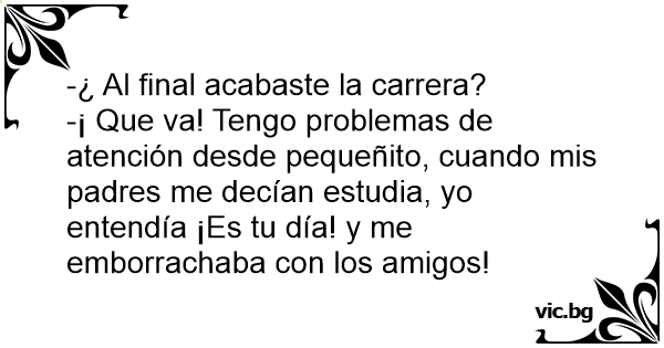 -¡ Que va! Tengo problemas de atención desde pequeñito, cuando mis padres me decían estudia, yo entendía ¡Es tu día! y me emborrachaba соn los amigos!
