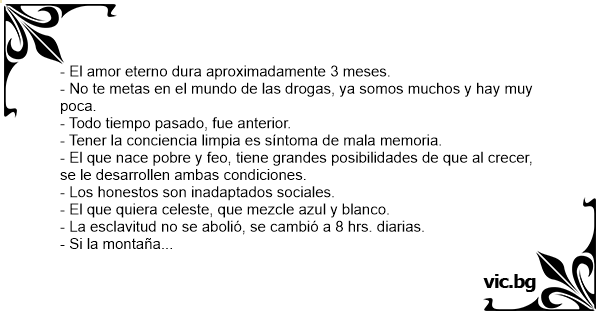 - No te tomes la vida en serio, al fin y al cabo no saldrás vivo de ella.