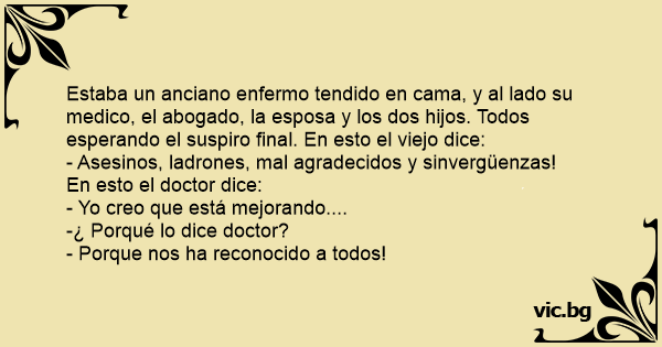 Estaba un anciano enfermo tendido en cama, y al lado su medico, el abogado, la esposa y los dos hijos. Todos esperando el suspiro final. En esto el viejo dice: