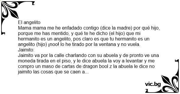 El angelito Mama mama me he enfadado contigo (dice la madre) por qué hijo, porque me has mentido, y qué te he dicho (el hijo) que mi hermanito es un angelito, pos claro es que tu hermanito es un angelito (hijo) ¡noo! lo he tirado por la ventana y no vuela. Jaimito: Jaimito va por la calle charlando соn su abuela y de pronto ve una moneda tirada en el piso, y le dice abuela la voy a levantar y me compro un maso de cartas de dragon bool z la abuela le dice no jaimito las cosas que se caen a el piso,no se levantan bueno a el rato habia un pozo la abuela se cayo y le dice a jaimito jaimito ¡Ayudaaaaaa! y jaimito le dice no abu, las cosas que se caen a el piso no se levantan. Solterona: A una solterona de 50 años mientras estaba sentada en una mecedora, al tiempo que acariciaba un gordo y panchorriento gato, se le presenta su hada madrina que le ofrece tres deseos. - Quiero ser una mujer rica - pide. - Concedido - dice el hada y le llena la casa de oro. - Quiero ser otra vez aquella bella señorita que fui. - Concedido - y rejuvenece por arte de la magia. - Quiero que mi gato se convierta en un príncipe azul. Y un joven musculoso de facciones perfectas y ojos azules como el océano le acaricia la frente y le dice: - Seguro que ahora te vas a arrepentir de haberme castrado.