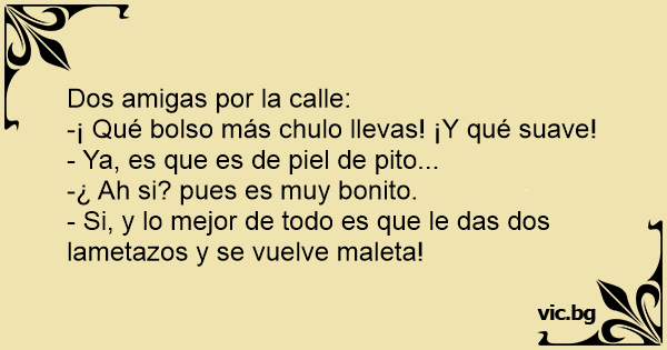 Dos amigas por la calle:<br />-¡ Qué bolso más chulo llevas! ¡Y qué suave!<br />- Ya, es que es de piel de pito...<br />-¿ Ah si? pues es muy bonito.<br />- Si, y lo mejor de todo es que le das dos lametazos y se vuelve maleta!
