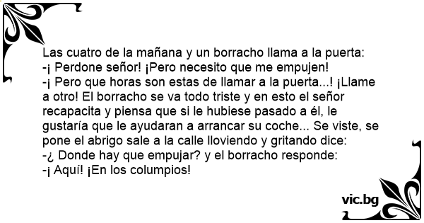 -¡ Pero que horas son estas de llamar a la puerta...! ¡Llame a otro! El borracho se va todo triste y en esto el señor recapacita y piensa que si le hubiese pasado a él, le gustaría que le ayudaran a arrancar su coche... Se viste, se pone el abrigo sale a la calle lloviendo y gritando dice: