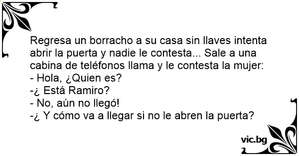 Regresa un borracho a su casa sin llaves intenta abrir la puerta y nadie le contesta... Sale a una cabina de teléfonos llama y le contesta la mujer: