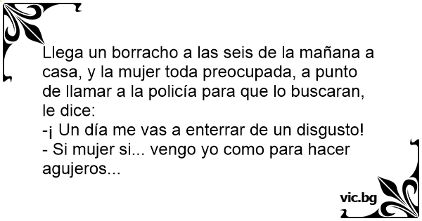 Llega un borracho a las seis de la mañana a casa, y la mujer toda preocupada, a punto de llamar a la policía para que lo buscaran, le dice: