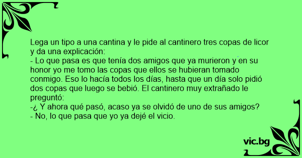 - Lo que pasa es que tenía dos amigos que ya murieron y en su honor yo me tomo las copas que ellos se hubieran tomado conmigo. Eso lo hacía todos los días, hasta que un día solo pidió dos copas que luego se bebió. El cantinero muy extrañado le preguntó: