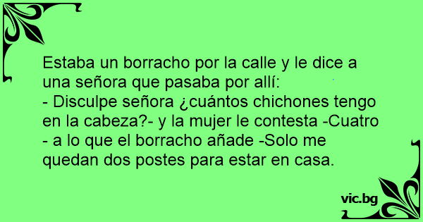 - Disculpe señora ¿cuántos chichones tengo en la cabeza?- y la mujer le contesta -Cuatro- a lo que el borracho añade -Solo me quedan dos postes para estar en casa.
