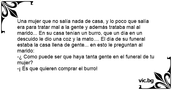 Una mujer que no salía nada de casa, y lo poco que salía era para tratar mal a la gente y además trataba mal al marido... En su casa tenían un вurrо, que un día en un descuido le dio una coz y la mato.... El día de su funeral estaba la casa llena de gente... en esto le preguntan al marido: