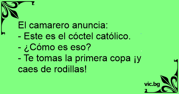 Сервитьора: - Този коктейл се нарича "католически"! - Защо?! - Изпиваш един и падаш на колене