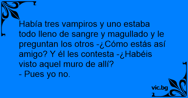 Un vampiro llega con toda la boca rebosante de sangre a donde estaba otro, y éste le dice: - Oye viejo, dime, ¿Dónde conseguiste toda esa rica sangre? El otro le respondió: - Bueno, ¿Ves ese muro...