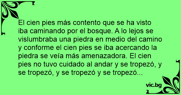 El cien pies más contento que se ha visto iba caminando por el bosque. A lo lejos se vislumbraba una piedra en medio del camino y conforme el cien pies se iba acercando la piedra se veía más amenazadora. El cien pies no tuvo cuidado al andar y se tropezó, y se tropezó, y se tropezó y se tropezó...