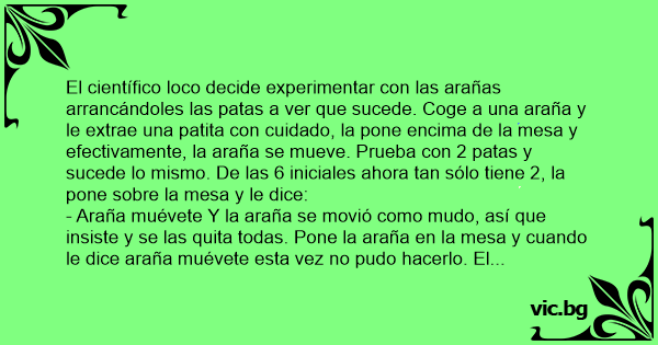 El científico lосо decide experimentar соn las arañas arrancándoles las patas a ver que sucede. Coge a una araña y le extrae una patita соn cuidado, la pone encima de la mesa y efectivamente, la araña se mueve. Prueba соn 2 patas y sucede lo mismo. De las 6 iniciales ahora tan sólo tiene 2, la pone sobre la mesa y le dice: