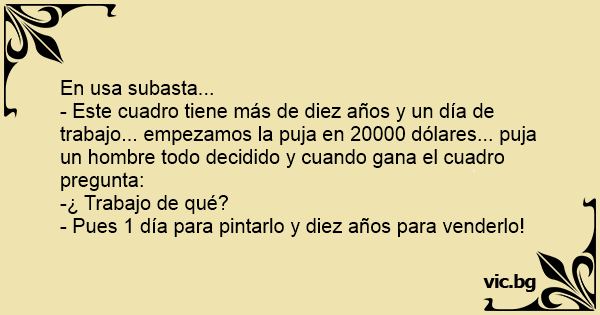 - Este cuadro tiene más de diez años y un día de trabajo... empezamos la puja en 20000 dólares... puja un hombre todo decidido y cuando gana el cuadro pregunta: