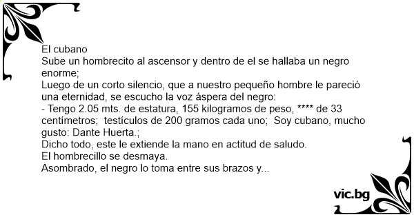 - Tengo 2.05 mts. de estatura, 155 kilogramos de peso, **** de 33 centímetros; testículos de 200 gramos cada uno; Soy cubano, mucho gusto: Dante Huerta.;