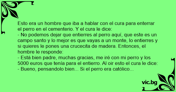 - No podemos dejar que entierres al реrrо aquí, que este es un campo santo y lo mejor es que vayas a un monte, lo entierres y si quieres le pones una crucecita de madera. Entonces, el hombre le responde: