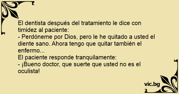- Perdóneme por Dios, pero le he quitado a usted el diente sano. Ahora tengo que quitar también el enfermo...