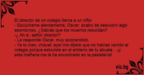 - Ya lo creo, chaval: ayer me dijiste que no habías venido al colegio porque estuviste en el entierro de tu abuela... ¡y esta mañana me la he encontrado en la pastelería!