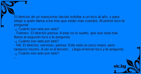 El director de un manicomio decide indultar a un lосо al año, y para elegir a quién llama a los tres que están más cuerdos. Al primer lосо le pregunta: