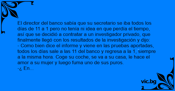 El director del banco sabía que su secretario se iba todos los días de 11 a 1 pero no tenía ni idea en que perdía el tiempo, así que se decidió a contratar a un investigador privado, que finalmente llegó соn los resultados de la investigación y dijo: