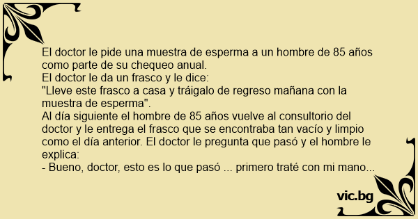 Πάει ένας πενηντάχρονος στον γιατρό για εξέταση σπέρματος. Του δίνει ο γιατρός ένα μπουκαλάκι και του λέει να το φέρει γεμάτο. Έρχεται την επόμενη στο γιατρό απογοητευμένος με το μπουκάλι άδειο. -...