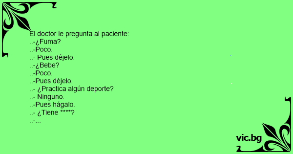 - El Dr. me recomendó dejar el tabaco, la bebida, hacer deporte, y sobre todo tener ****, mucho ****, todo el **** que sea posible.