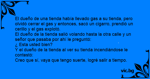 El dueño de una tienda había llevado gas a su tienda, pero olvidó cerrar el gas y entonces, sacó un cigarro, prendió un cerillo y el gas explotó.