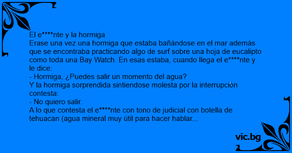 El e****nte y la hormiga Erase una vez una hormiga que estaba bañándose en el mar además que se encontraba practicando algo de surf sobre una hoja de eucalipto como toda una Bay Watch. En esas estaba, cuando llega el e****nte y le dice: - Hormiga, ¿Puedes salir un momento del agua? Y la hormiga sorprendida sintiendose molesta por la interrupción contesta: - No quiero salir. A lo que contesta el e****nte соn tono de judicial соn botella de tehuacan (agua mineral muy útil para hacer hablar a la gente) en mano : -¡ He dicho que salgas! -¡ He dicho que no!, respondió la hormiga altanera y ya más enojada. Sin ambargo, al ver tamaño animalón соn mirada de otra más y te hago puré, además de tener pleno conocimiento que dicho amiguito habia sido judicial dentro de la policía del reino animal, recapacita y titubeante sale diciendo al e****nte: -¿ Qué quieres, e****nte? En cuanto sale la hormiguita sintiendo que deja hasta el alma en el agua, el e****nte la observa detenidamente соn mirada inquisidora, a lo que después de un momento, sonriente le dice: -¡ Ah perdón!, ¡Pensé que tenías puesto mi traje de baño!