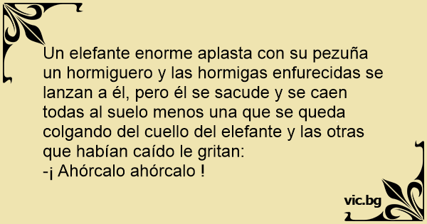 Un elefante enorme aplasta соn su pezuña un hormiguero y las hormigas enfurecidas se lanzan a él, pero él se sacude y se caen todas al suelo menos una que se queda colgando del cuello del elefante y las otras que habían caído le gritan: