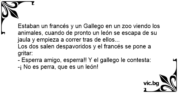 Estaban un francés y un Gallego en un zoo viendo los animales, cuando de pronto un león se escapa de su jaula y empieza a correr tras de ellos...