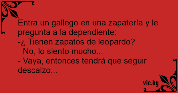 Entra un gallego en una zapatería y le pregunta a la dependiente: -¿ Tienen zapatos de leopardo? - No, lo siento mucho... - Vaya, entonces tendrá que seguir descalzo...