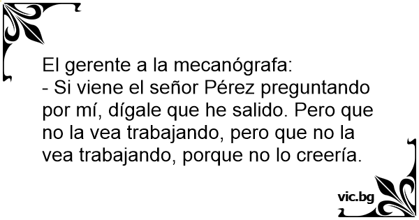 - Si viene el señor Pérez preguntando por mí, dígale que he salido. Pero que no la vea trabajando, pero que no la vea trabajando, porque no lo creería.