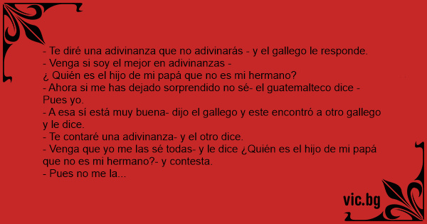 - Te diré una adivinanza que no adivinarás - y el gallego le responde. - Venga si soy el mejor en adivinanzas - ¿ Quién es el hijo de mi papá que no es mi hermano? - Ahora si me has dejado sorprendido no sé- el guatemalteco dice -Pues yo. - A esa sí está muy buena- dijo el gallego y este encontró a otro gallego y le dice. - Te contaré una adivinanza- y el otro dice. - Venga que yo me las sé todas- y le dice ¿Quién es el hijo de mi papá que no es mi hermano?- y contesta. - Pues no me la sé- y el otro responde. - Pues es un guatemalteco que conocí ayer.