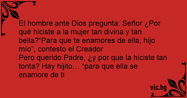 El hombre ante Dios pregunta: Señor ¿Por qué hiciste a la mujer tan divina y tan bella?“Para que te enamores de ella, hijo mío”, contesto el Creador
