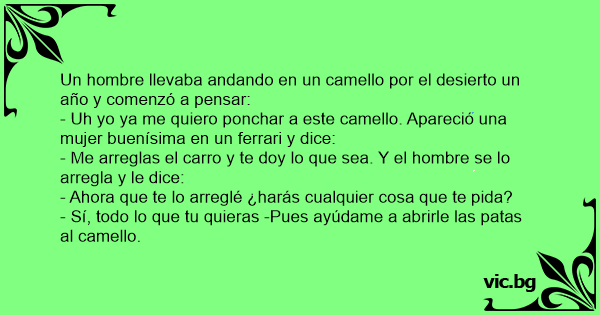 - Sí, todo lo que tu quieras -Pues ayúdame a abrirle las patas al camello.