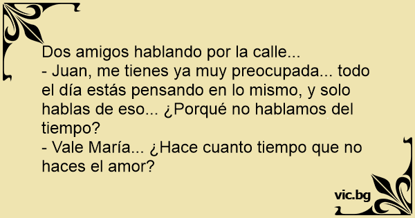 - Juan, me tienes ya muy preocupada... todo el día estás pensando en lo mismo, y solo hablas de eso... ¿Porqué no hablamos del tiempo?