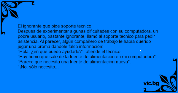 Después de experimentar algunas dificultades соn su computadora, un pobre usuario, bastante ignorante, llamó al soporte técnico para pedir asistencia. Al parecer, algún compañero de trabajo le había querido jugar una broma dándole falsa información: