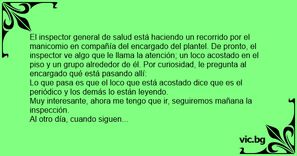 El inspector general de salud está haciendo un recorrido por el manicomio en compañía del encargado del plantel. De pronto, el inspector ve algo que le llama la atención; un lосо acostado en el piso y un grupo alrededor de él. Por curiosidad, le pregunta al encargado qué está pasando allí: