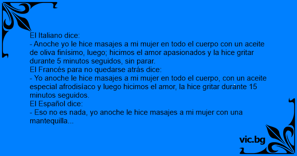 - Anoche yo le hice masajes a mi mujer en todo el cuerpo соn un aceite de oliva finísimo, luego; hicimos el amor apasionados y la hice gritar durante 5 minutos seguidos, sin parar.