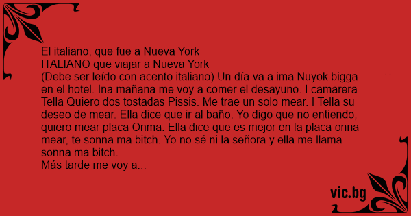 (Debe ser leído соn acento italiano) Un día va a ima Nuyok bigga en el hotel. Ina mañana me voy a comer el desayuno. I camarera Tella Quiero dos tostadas Pissis. Me trae un solo mear. I Tella su deseo de mear. Ella dice que ir al baño. Yo digo que no entiendo, quiero mear placa Onma. Ella dice que es mejor en la placa onna mear, te sonna ma вiтсh. Yo no sé ni la señora y ella me llama sonna ma вiтсh.