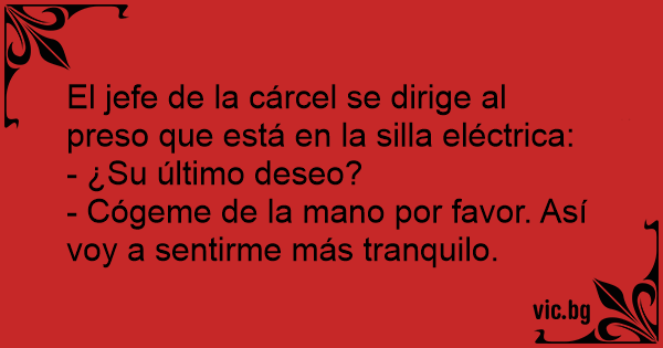 Cietuma priekšnieks jautā uz nāvi notiesātajam elektriskajā krēslā: - Kāda ir jūsu pēdējā vēlēšanās? - Paturiet, lūdzu, mani aiz rokas, tā es jutīšos drošāk.