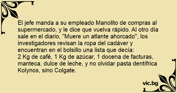 El jefe manda a su empleado Manolito de compras al supermercado, y le dice que vuelva rápido. Al otro día sale en el diario, "Muere un atlante ahorcado", los investigadores revisan la ropa del cadáver y encuentran en el bolsillo una lista que decía: 2 Kg de café, 1 Kg de azúcar, 1 docena de facturas, manteca, dulce de leche, y no olvidar pasta dentífrica Kolynos, sino Colgate.