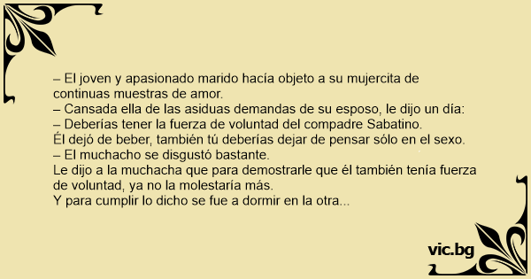 – A los diez días, la mujercita llamó tímidamente a la puerta de la recámara donde dormía su marido y le dijo соn humildosa voz: