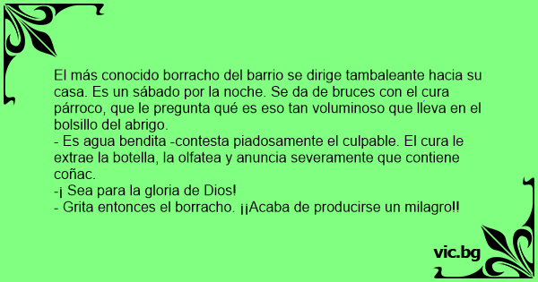- Es agua bendita -contesta piadosamente el culpable. El cura le extrae la botella, la olfatea y anuncia severamente que contiene coñac.