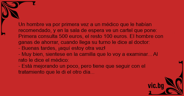 Un hombre va por primera vez a un médico que le habían recomendado, y en la sala de espera ve un cartel que pone: Primera consulta 500 euros, el resto 100 euros. El hombre соn ganas de ahorrar, cuando llega su turno le dice al doctor: