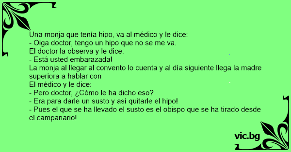 Un patient voit une bonne sœur sortir affolée du cabinet médical. Il demande : - Docteur, qu'est-ce qui lui est arrivé ? Le médecin répond, distraitement: - Je lui ai dit qu'elle était... Auch Nonnen müssen manchmal zum Frauenarzt. Der Gynäkologe macht einen Scherz und sagt zu der Schwester Hildegard: „Liebe Schwester, ich sag’ es Ihnen ungern, aber Sie sind schwanger“. Die... Una monja va al médico con un ataque de hipo que ya le dura un mes. - Doctor, tengo un ataque de hipo desde hace un mes que no me deja vivir. No duermo, no como, ya me duele el cuerpo de tanto... En eldre dame var på besøk hos sin nye lege. Etter få minutter stormet hun ut av kontoret hans og løp skrikende nedover korridoren. En annen lege spurte henne hva problemet var. Etter å ha snakket... Ein Mann wartet beim Arzt auf seinen Termin, als eine junge Nonne weinend aus dem Behandlungszimmer stürmt. "Herr Doktor, was haben Sie denn mit der gemacht?" "Ich habe ihr gesagt, dass sie... Mottagningssköterskan hajade till när dörren till läkarmottagningen plötsligt slogs upp och en nunna rusade ut, högröd i ansiktet och med uppspärrade ögon. - Vad i hela fridens namn tog det åt... Een vrouw is op doktersbezoek bij de nieuwe dokter in de praktijk. Na 4 minuten in de onderzoekkamer gooit ze de deur open en rent gillend door de gang. Aan het einde van de gang wordt zij... C'est une femme du troisième âge qui va consulter le médecin. Cinq minutes après être entrée dans le cabinet, elle sort et passe en hurlant et en pleurant dans la salle d'attente... Le patient... Anna mår dåligt och bestämmer sig för att gå till doktorn. Medans hon väntar i doktorns reception så kommer en nunna gående på darriga ben från undersökningsrummet. Hon ser chockad och vit ut i ansiktet. Anna går in till doktorn och frågar honom, -... A freira vai ao médico: — Doutor, estou com um ataque de soluços horrível. Não consigo comer, nem dormir... nada. — Tenha calma, irmã, que vou examiná-la. Ele examina-a e diz: — Irmã, a senhora está grávida! A freira se levanta em pânico e sai correndo do consultório. Uma hora depois o médico... A woman went to her doctor's office. She was seen by one of the new doctors, but after about 4 minutes in the examination room, she burst out screaming and ran down the hall. Една монахиня не спирала да хълца и отива на доктор. Жена влиза в лекарския кабинет, където на смяна е млад лекар. Une bonne Soeur va chez le médecin, avec une crise de hoquet qui dure depuis déjà un mois. Γιατροί.... мария петровна пошла к врачу. ее записали на прием к совсем... Λόξυγκας A freira vai ao médico reclamando de uma forte crise de soluço. — Calma, irmã... Deixe-me examiná-la... Hum... Já sei! — O que é? – pergunta ela, aflita. — Você está grávida! Ouvindo isso a freira... Una suora che aveva il singhiozzo va dal medico e dice al dottore che soffre di questo disturbo che non le passa. Il dottore la visita e poi le dice: “Lei è incinta”. La suora torna al convento e... Soeur Marguerite vient consulter le médecin, secouée par un terrible hoquet. - Je n'en peux plus docteur, cela fait un mois maintenant que je ne dors plus, que je ne mange presque plus, et que je... Orvoshoz megy az apáca, mert nem akar elmúlni a csuklása. Pár perc múlva sírva rohan ki a rendelőből. - Mi történt, doktor úr? - kérdezi az ápolónő. - Közöltem vele, hogy terhes. - Ez ......