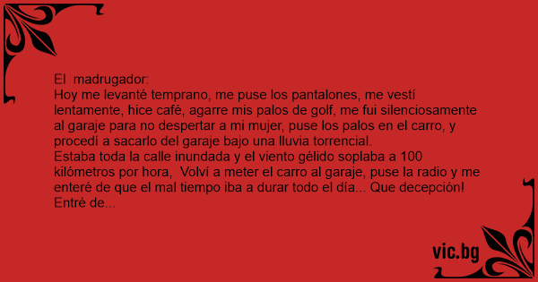 Hoy me levanté temprano, me puse los pantalones, me vestí lentamente, hice café, agarre mis palos de golf, me fui silenciosamente al garaje para no despertar a mi mujer, puse los palos en el carro, y procedí a sacarlo del garaje bajo una lluvia torrencial.