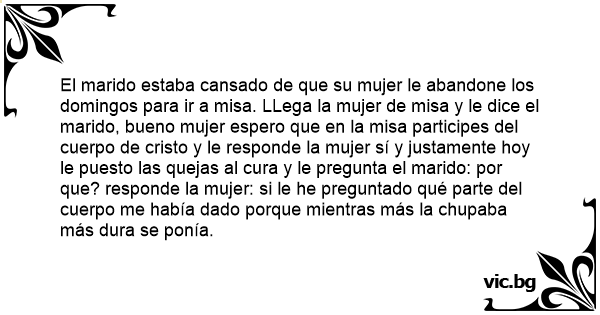 El marido estaba cansado de que su mujer le abandone los domingos para ir a misa. LLega la mujer de misa y le dice el marido, bueno mujer espero que en la misa participes del cuerpo de cristo y le responde la mujer sí y justamente hoy le puesto las quejas al cura y le pregunta el marido: por que? responde la mujer: si le he preguntado qué parte del cuerpo me había dado porque mientras más la chupaba más dura se ponía.
