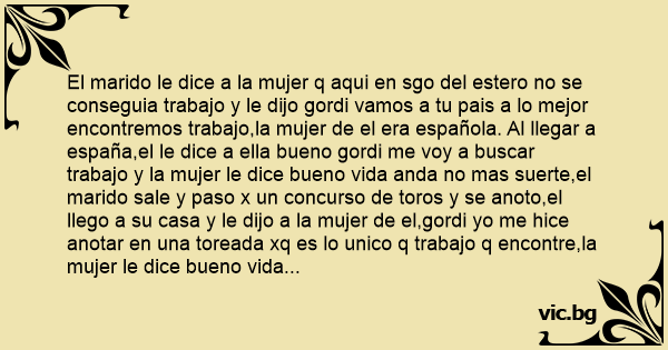 El marido le dice a la mujer q aqui en sgo del estero no se conseguia trabajo y le dijo gordi vamos a tu pais a lo mejor encontremos trabajo,la mujer de el era española. Al llegar a españa,el le dice a ella bueno gordi me voy a buscar trabajo y la mujer le dice bueno vida anda no mas suerte,el marido sale y paso x un concurso de toros y se anoto,el llego a su casa y le dijo a la mujer de el,gordi yo me hice anotar en una toreada xq es lo unico q trabajo q encontre,la mujer le dice bueno vida no hay problema,el marido se va a la toreada,y cuando llega lo preparan y lo largan соn el toro,cuando termina la toreada vuelve a su casa hecho ****,соn el sombre al frente como cristobal colon y su pantalon hecho ****,y al llegar a su casa le dijo la mujer oye vida q te cojio el toro y el marido le dice no pero lo unico q le ah faltado a ese hijo de put* jejejejejejeje,bueno espero q les guste mis chiste de toreros
