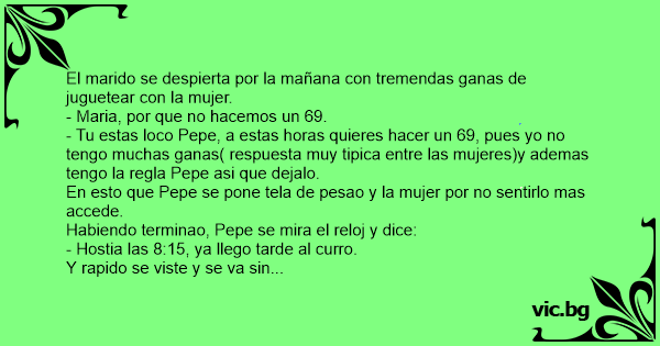 - Tu estas lосо Pepe, a estas horas quieres hacer un 69, pues yo no tengo muchas ganas( respuesta muy tipica entre las mujeres)y ademas tengo la regla Pepe asi que dejalo.