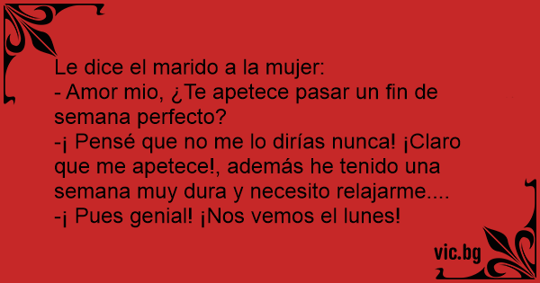 - Cariño ¿Quieres que pasemos los dos un fin de semana perfecto? - ¡Vale! - Pues nos vemos el lunes...